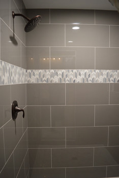 The accent ribbon in the shower is a white and gray mosaic marble tile. I love the design because it looks like arrows pointing up. If you're a part of the T21 family, you'll understand why this is significant for me. The accent ribbon is set off by a thin, pencil frame border. We chose to do a large, rain head shower head in oil rubbed bronze (Eva) from Moen Pro.